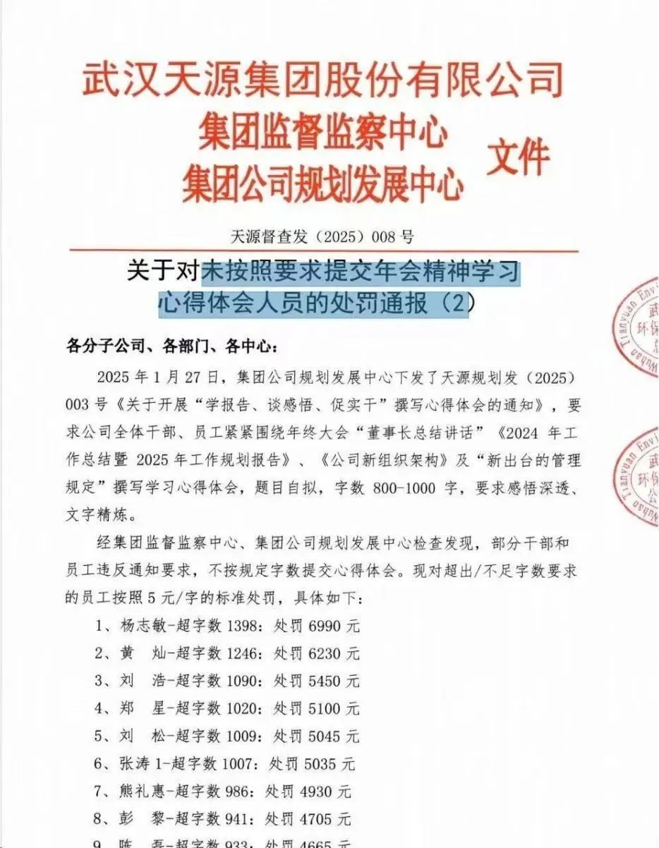 通报显示,1月27日,集团下发了《关于开展“学报告、谈感悟、促实干”撰写心得体会的通知》,要求公司全体干部员工围绕年终大会“董事长总结讲话”《2024年工作总结暨2025年工作规划报告》《公司新组织架构》及“新出台的管理规定”撰写学习心得体会,其中提到“题目自拟,字数800-1000字”。